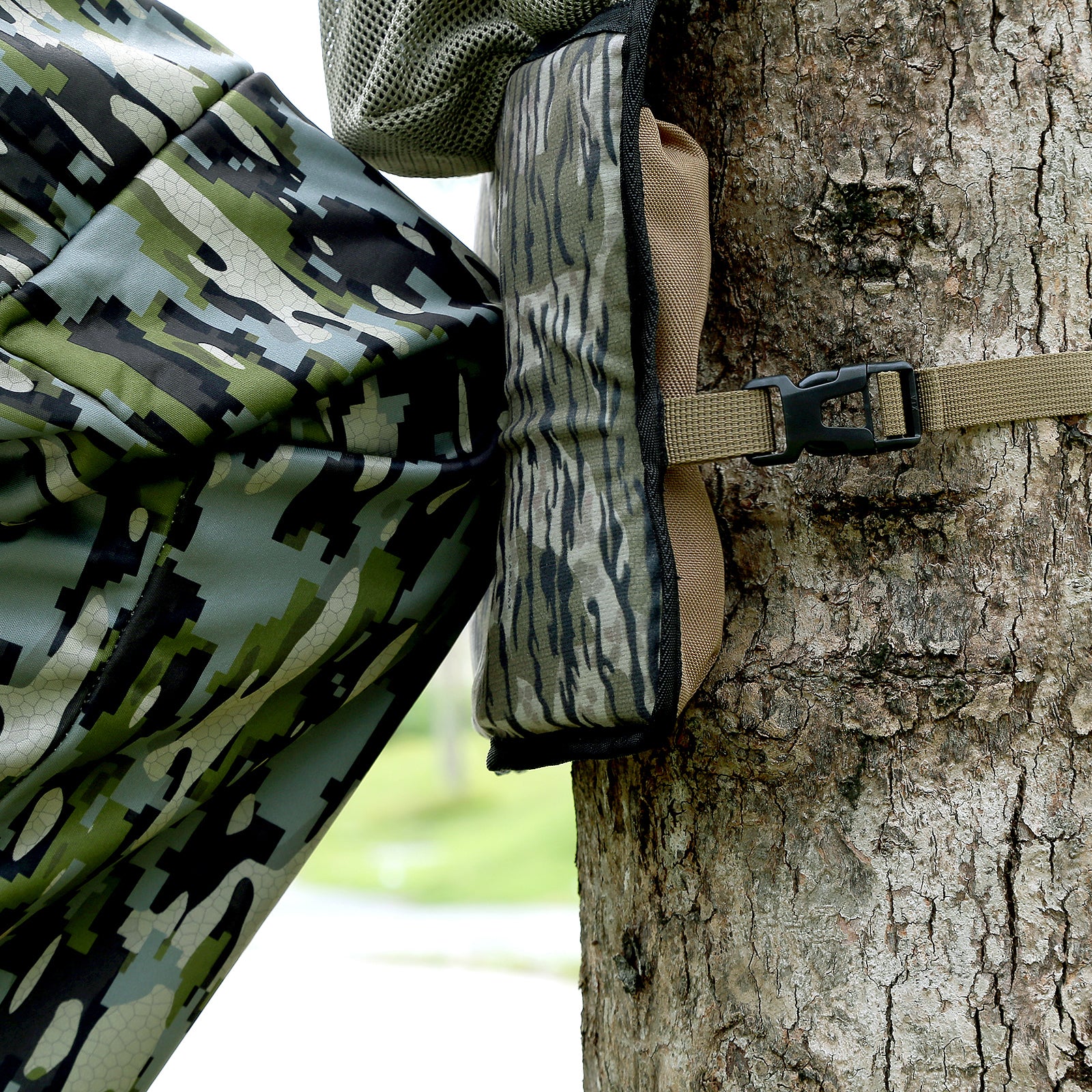- ADJUSTABLE 57" TREE WRAP STRAP: Equipped with durable brown straps and quick-adjust buckles, this pad wraps securely around most tree sizes. It pairs perfectly with saddle hunting knee pads for men and other saddle hunting accessories, delivering a firm hold without slipping—ideal for bowhunting or still ambush setups.
